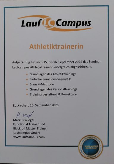 Aus diesem Grund habe ich an der Laufcampus Akademie eine Ausbildung zur zertifizierten Lauftrainerin und Leistungsdiagnostikerin absolviert und bilde mich aktuell auch noch weiter fort.